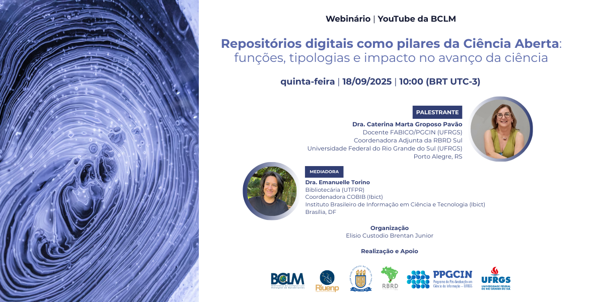 Neste webinário, a Dra. Caterina Marta Groposo Pavão (UFRGS) explorará como os repositórios digitais se consolidaram como alicerces indispensáveis da Ciência Aberta, garantindo que o conhecimento científico seja acessível, organizado e de alto impacto. Além disso, discutiremos como essas plataformas devem seguir boas práticas de gestão para maximizar sua eficiência, fomentar a colaboração global, a transparência metodológica e a inovação acelerada na pesquisa científica.